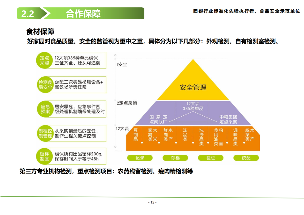 公司自有食材供應鏈中心和全程生鮮冷鏈運輸一體化的配送系統,通過整合綠色蔬菜、養殖基地,建立集植、養殖等規模化生產、標準化管理的可控可追溯基地。通過整合上游供應商,統一采購,統 一加工,統一配送,以科學、合理、規范的現代化模式為客戶提供安全的高品質農副產品,構建從種子到餐桌全產業鏈運作。